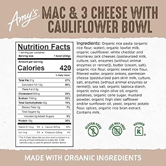 - This frozen food is a good source of dietary fiber and contains 16g of protein per serving; Amy’s cauliflower and rice mac and cheese frozen meals are Non-GMO, Gluten Free, Tree Nut Free, Soy Free and Certified Kosher, so you can enjoy plant based food and quick meals without compromise