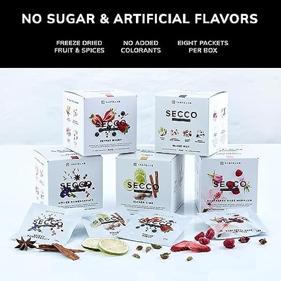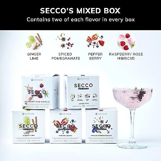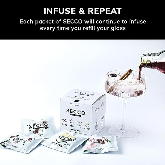 - 𝐁𝐎𝐗 𝐎𝐅 𝟖 𝐌𝐔𝐋𝐓𝐈-𝐔𝐒𝐄 𝐒𝐀𝐂𝐇𝐄𝐓𝐒 : Each Secco box includes eight sachets of natural drink infusion blends. Refill your glass as many times as you like and Secco will keep releasing flavor, aromatics and natural color. These DIY cocktail mixers will make any party a hit by elevating the average cocktail to mixologist standards.